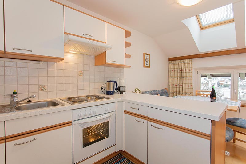 Unsere Ferienwohnung 5 in Lofer befindet sich im Hauptgebäude, in der 2. Etage unter dem Dach, ohne Balkon. Die helle und lichtdurchflutete Ferienwohnung besitzt im Wohnbereich drei Dachfenster und bietet auf 58 m² Platz für bis zu 4 Personen.